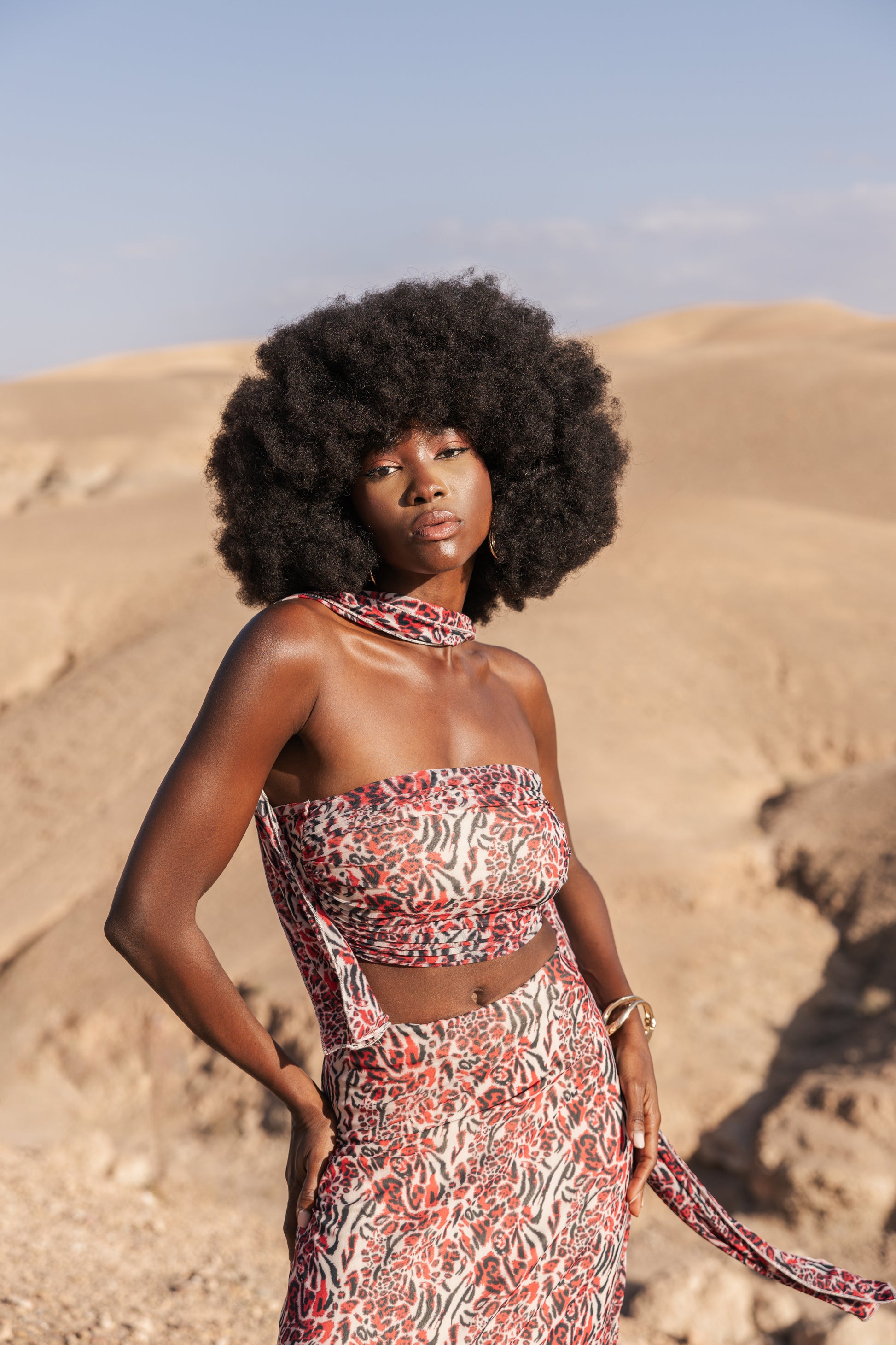 Découvrez notre ensemble co-ord audacieux, arborant un imprimé sauvage dans des tons rouges et noirs saisissants sur un tissu doux et fluide. Avec sa longue jupe ajustée, son top bustier structuré et son foulard léger, cet ensemble est à la fois audacieux et élégamment chic. Le tissu fluide se déplace gracieusement, tandis que le bustier offre un excellent maintien pour un ajustement parfait. Chaque détail a été soigné à la perfection—nous avons hâte que vous en tombiez amoureux !